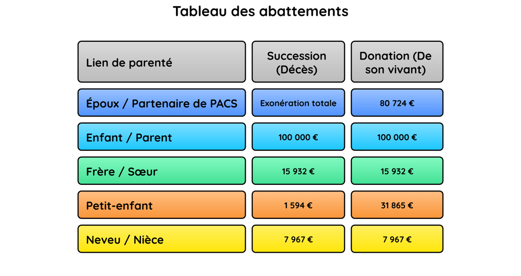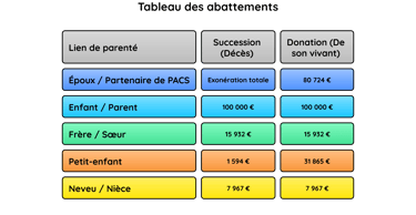 Les héritiers : On prend la part de chaque héritier, puis on applique un abattement en fonction du lien de parenté avec le défunt.