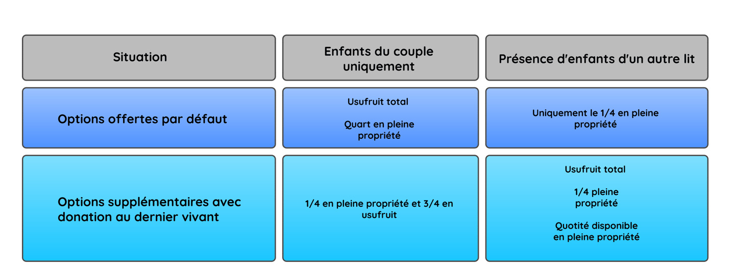 En France, lorsque tous les enfants sont issus du couple, le conjoint survivant bénéficie d'une option légale protectrice. Selon le Code civil, il peut choisir entre deux solutions :