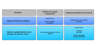 Si une «donation au dernier vivant» a été réalisée chez un notaire, alors le conjoint survivant dispose d'une 3ème option : 1/4 en plein propriété et 3/4 en usufruit, ce qui est encore plus protecteur.