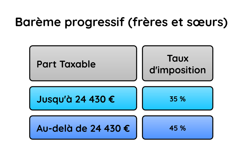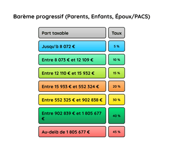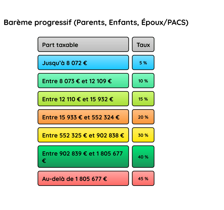 Après avoir appliqué l'abattement, le surplus est soumis au barème des droits de donation et de succession, toujours en fonction de votre lien de parenté. avec le défunt ou le donateur. Il s'agit d'un barème progressif qui découpe votre somme en plusieurs morceaux, et chaque morceau est taxé à un taux différent.