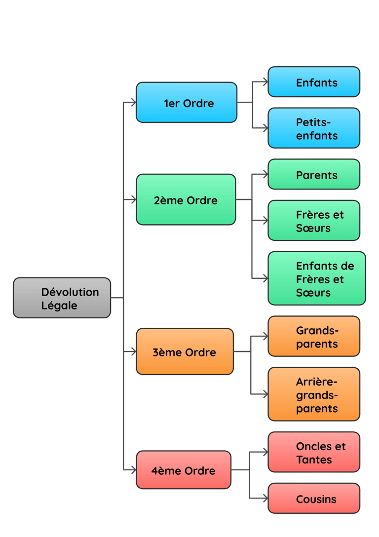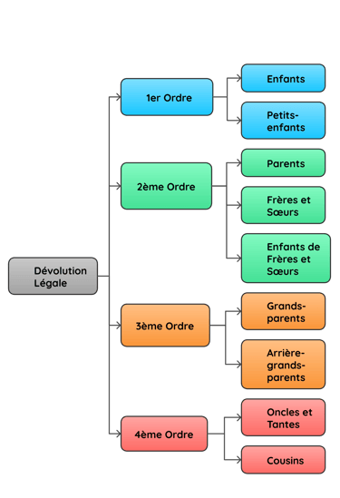 En France, la dévolution légale désigne les règles fixées par le Code civil pour désigner vos héritiers en l'absence de testament. C'est "l'ordre par défaut" qui s'applique si vous n'avez rien prévu. Chaque ordre exclut les suivants. A noter que le conjoint marié est automatiquement héritier contrairement au partenaire de PACS.
