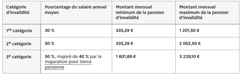 Le montant de votre pension d'invalidité est calculé sur la base d'un salaire annuel moyen obtenu à partir des 10 meilleures années de salaire dans la limite du plafond annuel de la sécurité sociale (PASS = 48060€). La pension d’invalidité est versée tant que l’état d’invalidité est reconnu et au plus tard jusqu’à l’âge légal de départ à la retraite.