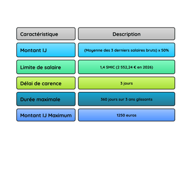Le montant des indemnités journalières (IJ) versées par la sécurité sociale sera calculé en fonction de vos 3 derniers salaires bruts. Les salaires sont pris en compte dans la limite de 1,4 SMIC soit 2 552,24 euros en 2026. Il existe un délai de carence de 3 jours avant le début de l'indemnisation. La durée maximale d'indemnisation est de 360 jours sur 3 ans glissants. En cas d'affection de longue durée (ALD), la durée maximale est de 3 ans.