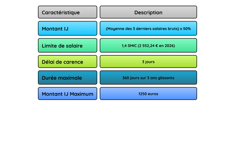 Montant IJ = (Moyenne des 3 derniers salaires bruts) x 50%