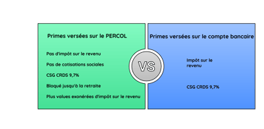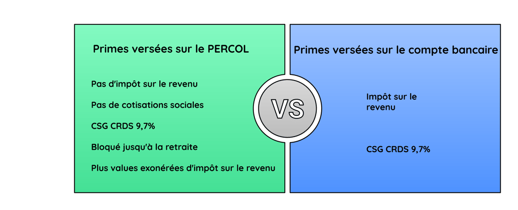 il peut placer les sommes issues de l'épargne salariale (participation, intéressement, abondement) dans son PERCOL. Elles sont exonérées d'impôt sur le revenu et de cotisations sociales mais soumises à la CSG CRDS à hauteur de 9,7%. De plus, les plus-values réalisées sur le plan sont également exonérées d'impôt (quelque soit le motif de déblocage) et seront soumises aux prélèvements sociaux à hauteur de 18,6% depuis le 1er janvier 2026.