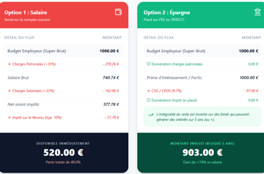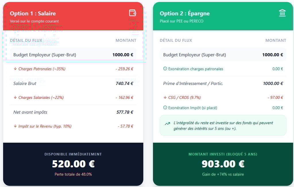 Voici une comparaison salaire vs épargne salariale sur un budget de rémunération de 1 000€.