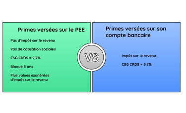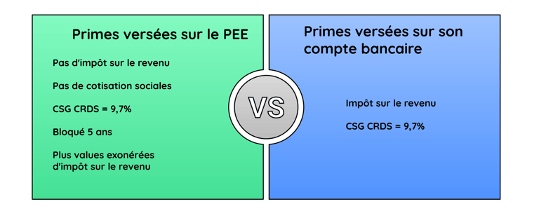 il peut placer les sommes issues de l'épargne salariale (participation, intéressement, abondement) dans son PEE. Elles sont exonérées d'impôt sur le revenu et de cotisations sociales mais soumises à la CSG CRDS à hauteur de 9,7%. De plus, les plus-values réalisées sur le plan sont également exonérées d'impôt (quelque soit le motif de déblocage) et seront soumises aux prélèvements sociaux à hauteur de 18,6% depuis le 1er janvier 2026.