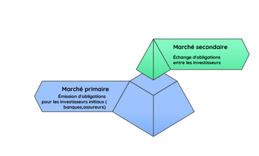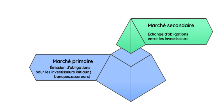 Les obligations sont émises sur un marché primaire, le marché du "neuf" souvent réservé aux assureurs et aux banques au vu des montants prêtés. Puis elles sont échangeables grâce au marché secondaire via la Bourse , c'est le marché de "l'occasion".