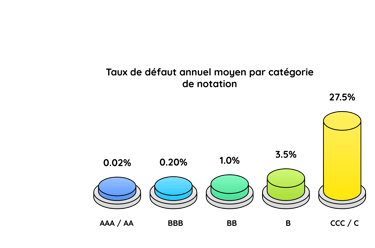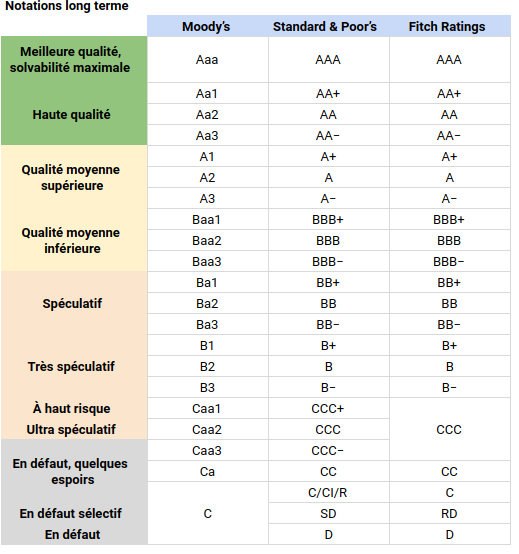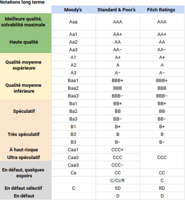 le risque de crédit : l'émetteur de l'obligation peut connaître des difficultés et ne pas être en mesure de rembourser sa dette. Plusieurs agences de notations internationale évaluent la capacité d'un emprunteur, une entreprise, un État, une collectivité à rembourser sa dette en lui attribuant une note de crédit. Plus la note est élevée, plus l'émetteur sera de confiance et plus le taux d'intérêt sera faible.