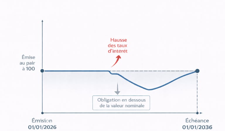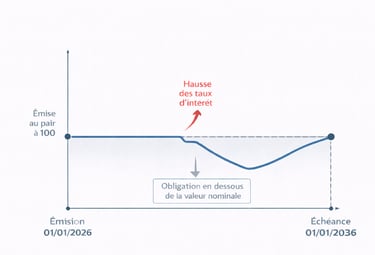 Scénario A : Les taux montent à 4 %. L'État français émet désormais de nouvelles obligations qui rapportent 4 %. Si vous voulez revendre votre obligation (qui ne rapporte que 2 %), personne n'en voudra au prix fort. Pour trouver un acheteur, vous êtes obligé de baisser votre prix de vente.