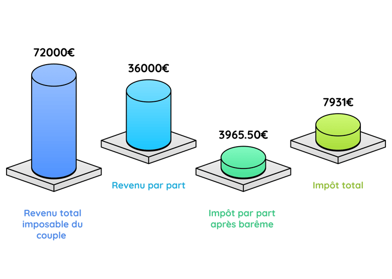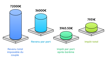 Revenu imposable pour une part : 72 000 € / 2 = 36000 €