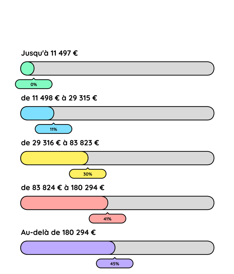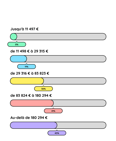 Exemple : Si votre revenu par part est de 30 000 €, vous ne payez pas 30 % sur tout. Vous payez 0 % sur les premiers 11 497 €, puis 11 % sur la part entre 11 498 € et 29 315 €, et enfin 30 % uniquement sur ce qui dépasse 29 316 €.