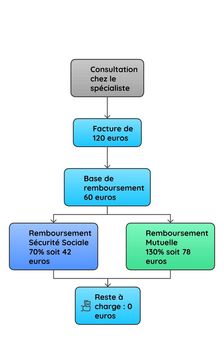 Exemple 2 : Supposons que votre contrat de mutuelle prenne en charge les consultations de spécialiste à hauteur de 130% de la BRSS. Vous consultez un spécialiste qui vous facture 120 euros.