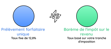 le barème de l'impôt sur le revenu ; vos gains seront ajoutés à votre revenu imposable. Si vous choisissez cette option, une partie des prélèvements sociaux sera déductible de votre revenu imposable et vos dividendes seront imposés sur 60% de leur valeur (grâce à un abattement de 40%).