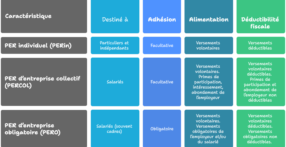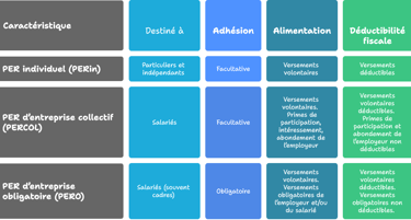 Il existe trois formes différentes de PER dont 2 qui peuvent être souscrit uniquement via votre entreprise.