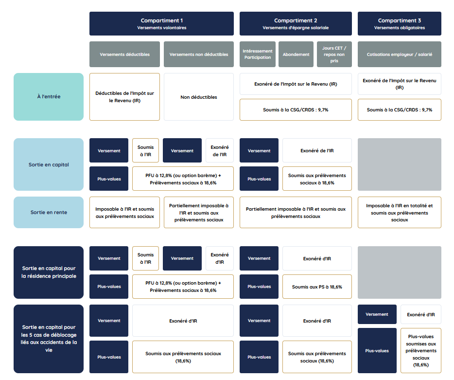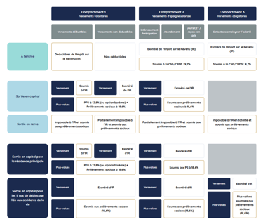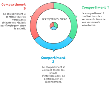 Ce système de transfert est rendu possible car chaque PER existant est segmenté en 3 « compartiments » qui contiennent chacun un type de versement bien particulier ;