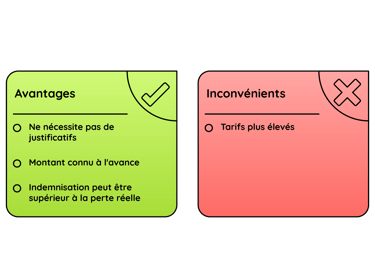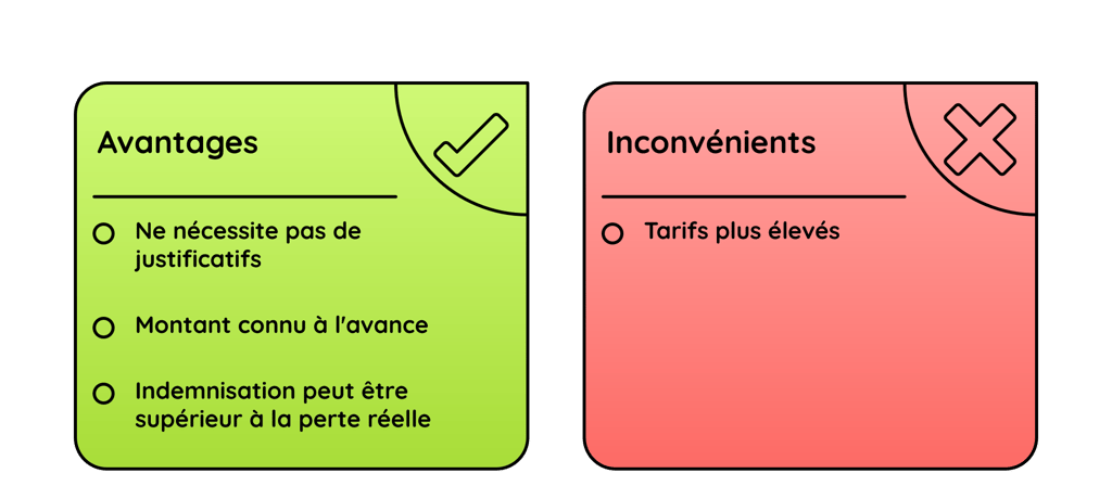 Le montant de l'indemnisation est fixé à l'avance lors de la signature du contrat (ex: 50 € par jour). Peu importe ce que l'assuré gagne réellement au moment du sinistre ou ce que versent les autres organismes, l'assureur paie la somme prévue au contrat. C’est beaucoup plus sécurisant pour les personnes ayant des revenus variables ou en début d'activité, car on connaît précisément le montant d'argent que l'on recevra.