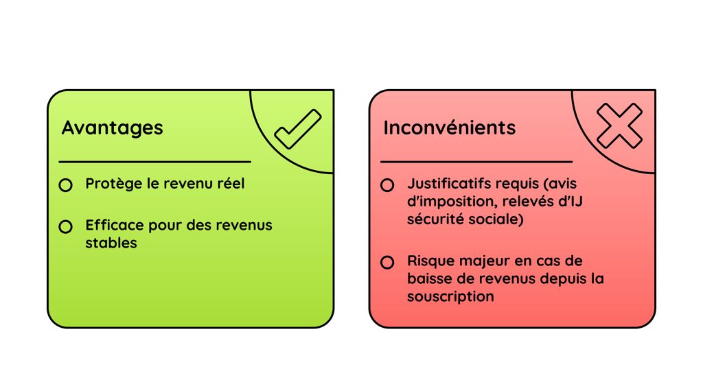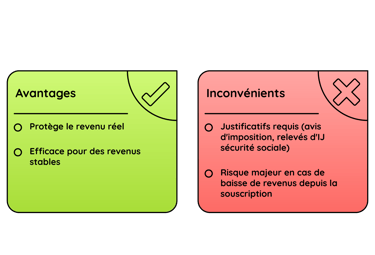 L'assureur compense la perte de revenus réelle. On regarde ce que le salarié ou le travailleur indépendant gagne au moment de l'arrêt, on déduit ce que la Sécurité sociale verse déjà, et l'assureur paie le reste (jusqu'à la limite du contrat, ex: 80% ou 100% du salaire). L'assuré ne peut pas gagner plus en étant en arrêt maladie qu'en travaillant , c'est le principe de non-enrichissement.